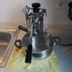 As you can see i had the portafilter with a single basket locked in the grouphead, if you don’t have a bottomless portafilter do not use it while purging the grouphead, the water will shoot out of the spout(s) and end up on the walls left (and right) of the machine, not in the kettle. The only reason i locked it in was because i wanted to flush some water through the basket that had been in a citric acid solution as well.