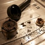 Yesterday, I had left the portafilter filled with coffee attached to the coffee machine by mistake and I turned it on. When I realized that it was attached to the machine, I tried to detach the portafilter from it. Just as I was starting to untwisting it, it exploded and the portafilter dropped on the metal base while the force of the steam bent it. Wow, I cleaned everything and unbend the metal base. I left it there until this morning.